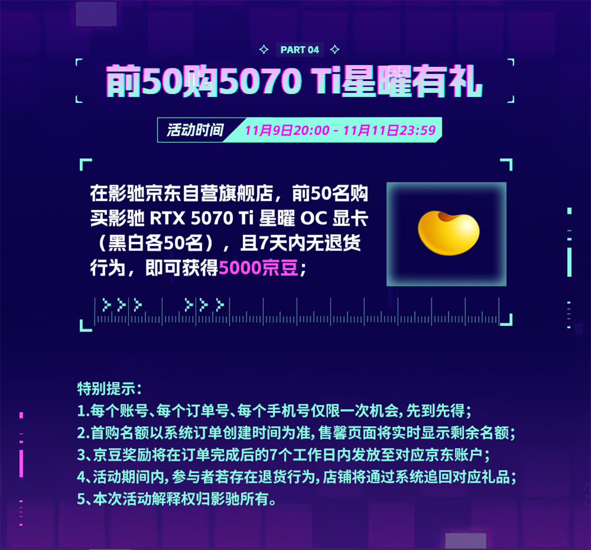 活动内容:前50名购买影驰 RTX 5070 Ti 星曜 OC 显卡(黑白两色各50名)并在7天内无退货的用户,即可获赠5000京豆!名额有限,先到先得。(名额实时更新,可联系客服查询余量)